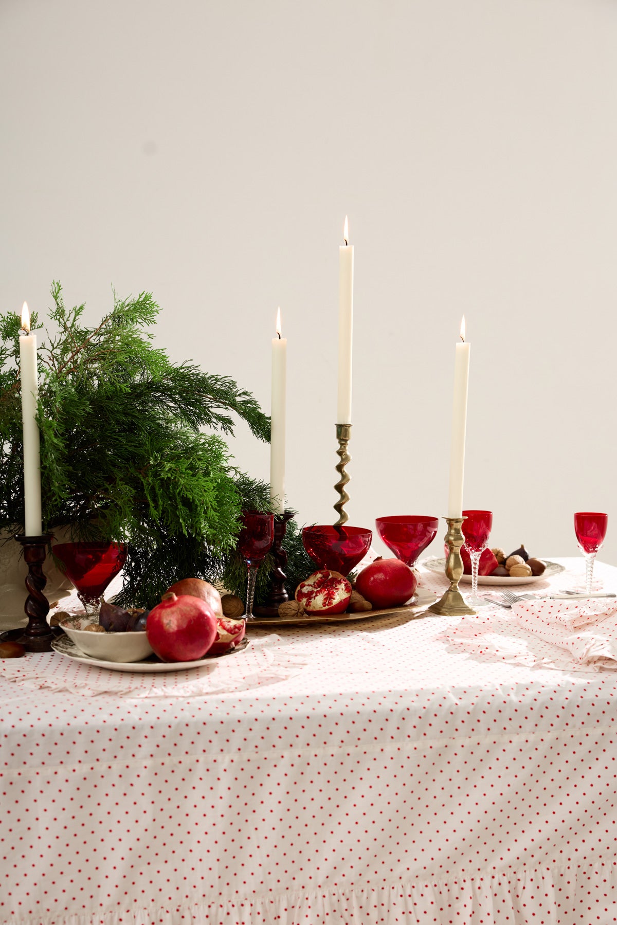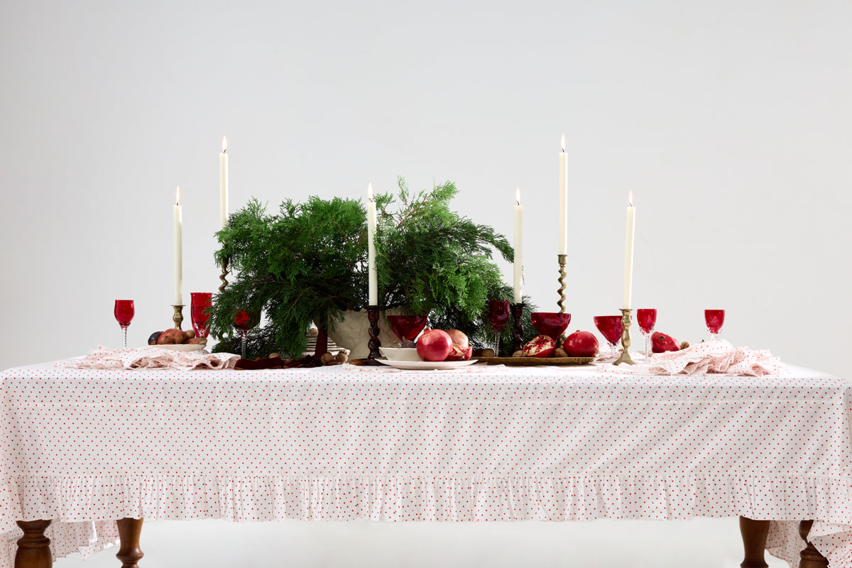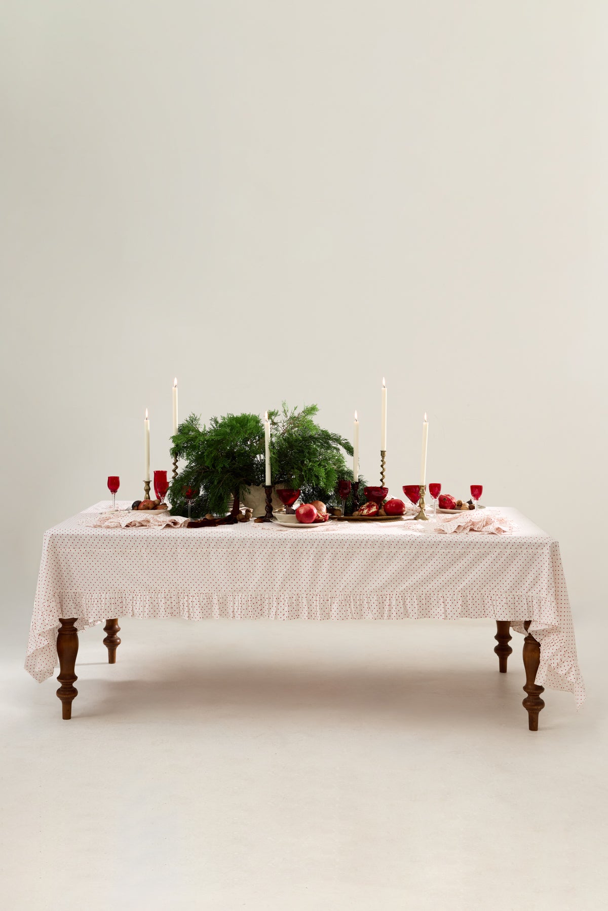 A hard to find jumbo size tablecloth finished with ruffles, ditsy dots. All the trimmings just like a Christmas ham blinged up with maraschino cherries & pineapple. Love ham & toast as much as this tablecloth all summer holidays long. 100% Cotton & 100% Classic. Just add pav, prawns, perrier jouet