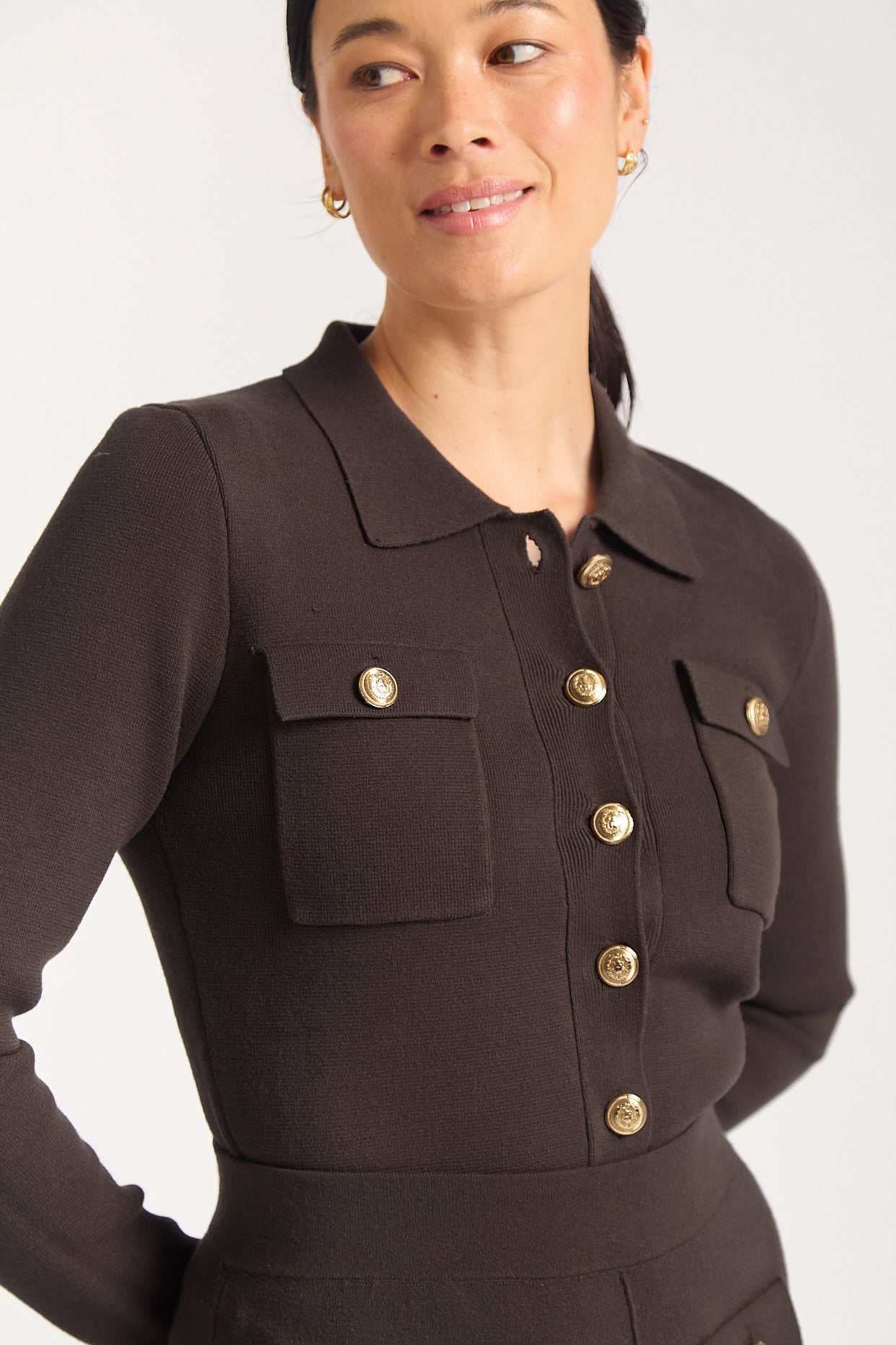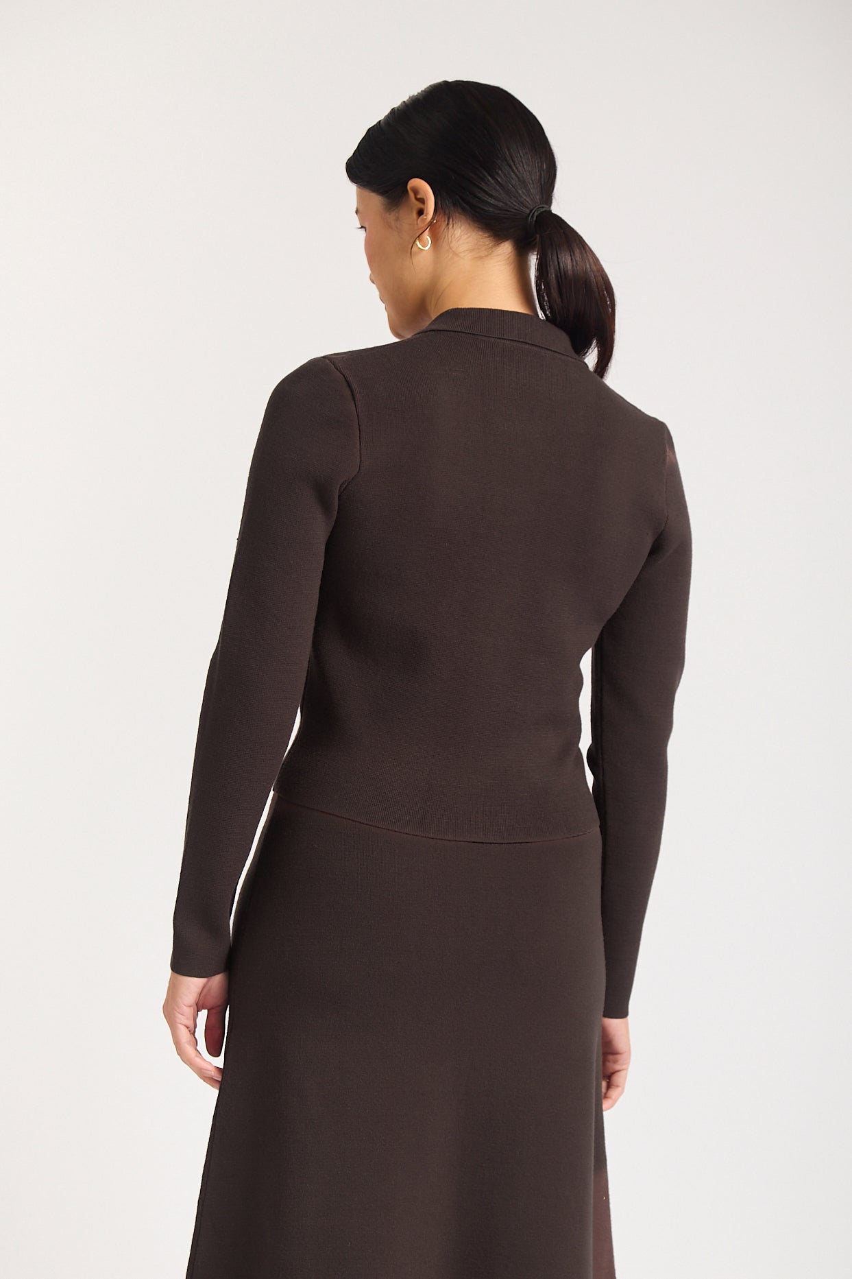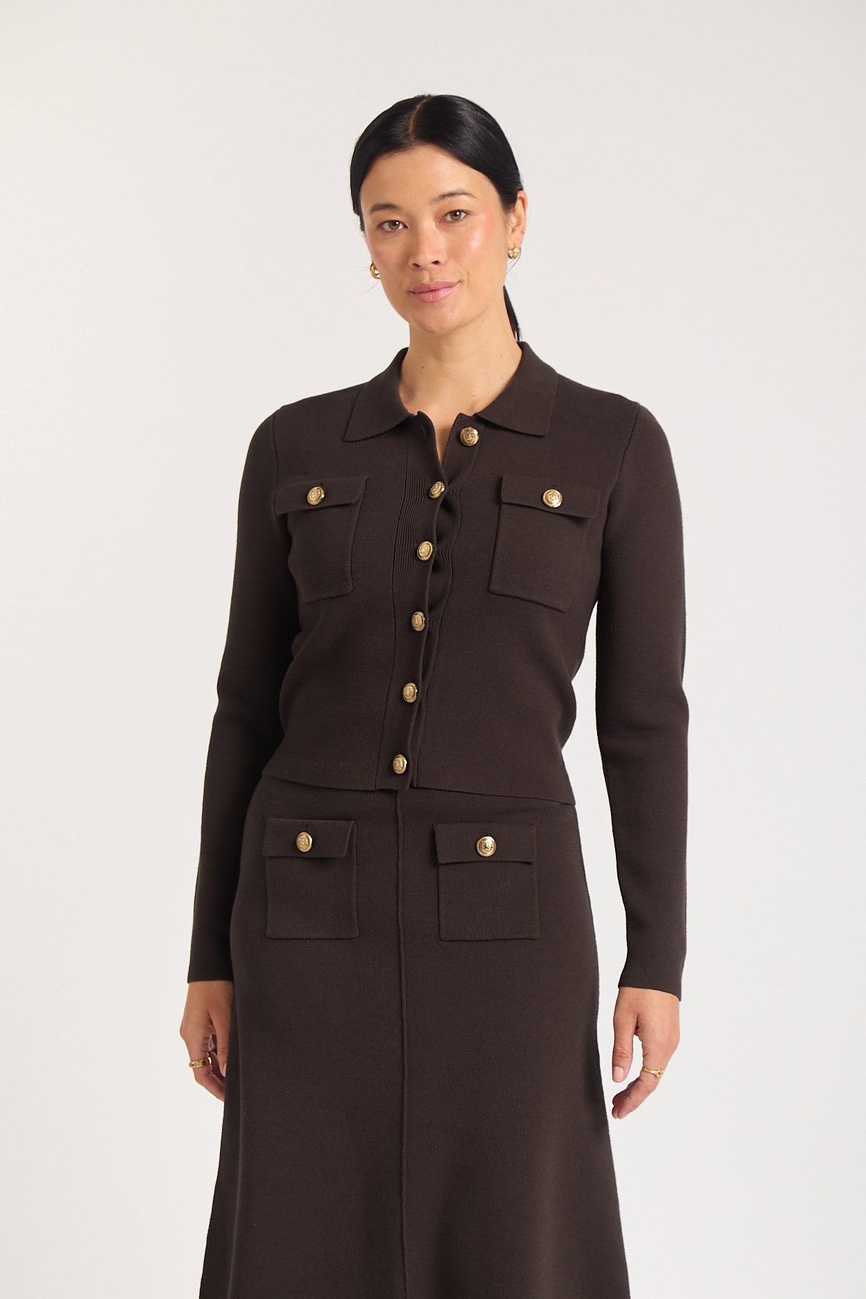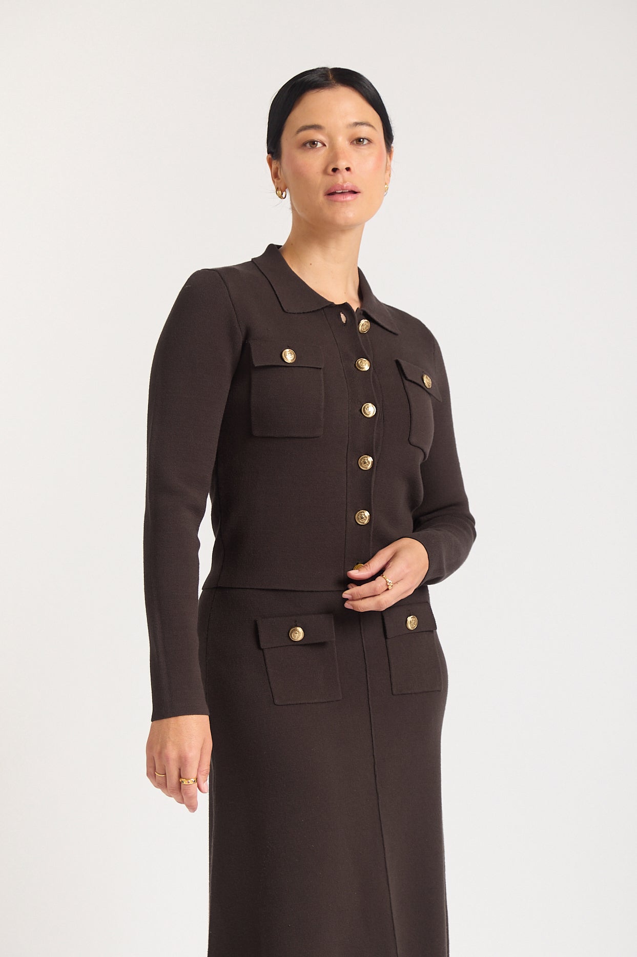 The Carter Jacket in rich chocolate is a sophisticated layering piece crafted from a luxurious viscose-blend fabric. Featuring a classic collared neckline and button-down front with elegant covere