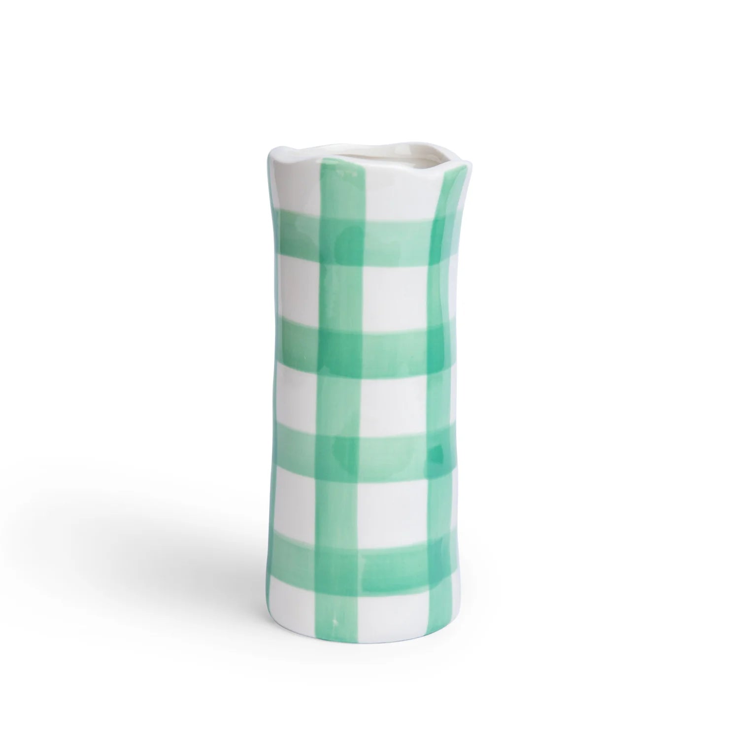 Bring organic elegance to any space with this hand-painted Noss & Co vase. Crafted from durable stoneware porcelain and featuring a beautiful mint green gingham design, each piece is individually painted, making it truly one-of-a-kind. Standing 17cm tall with a 6.5cm diameter, it's perfectly sized for shelves, desks or retail displays. Arrives in a vibrant gift box with protective padding. Hand wash only. Designed in Australia, created with care.