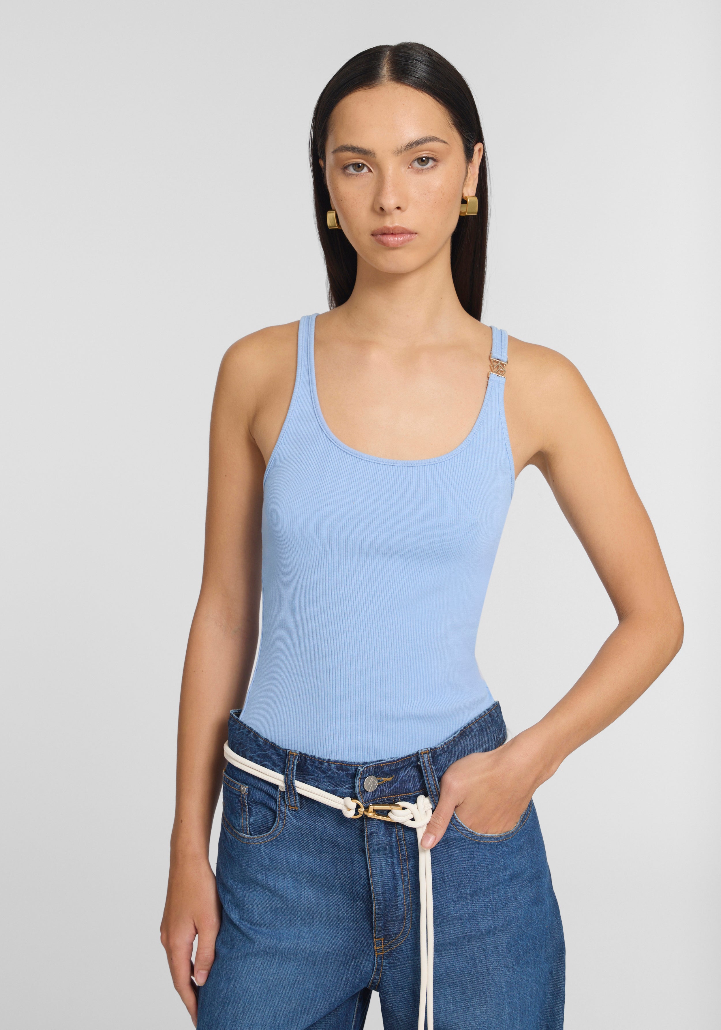 Bring new life to your everyday essentials with the Victor Tank, an elevated take on the classic tank top. Crafted from our signature 2x2 organic cotton rib in a saltwater blue hue, this fitted silhouette showcases a flattering scoop neckline and sleek V&W hardware on the strap. The perfect starting point for any outfit, it exudes effortless luxury with every wear.
