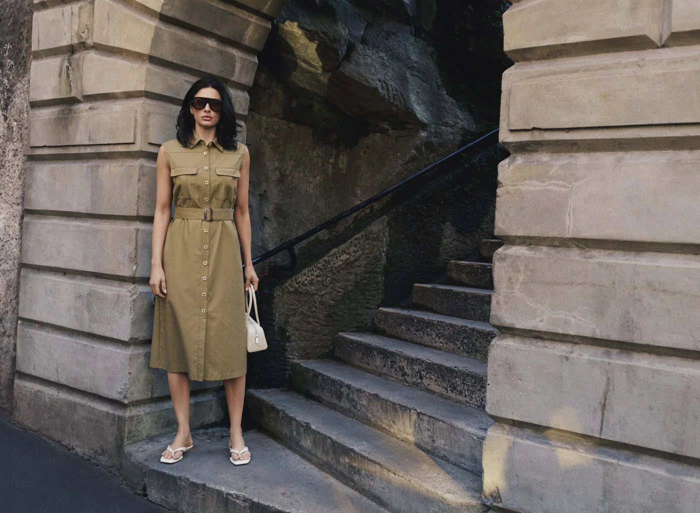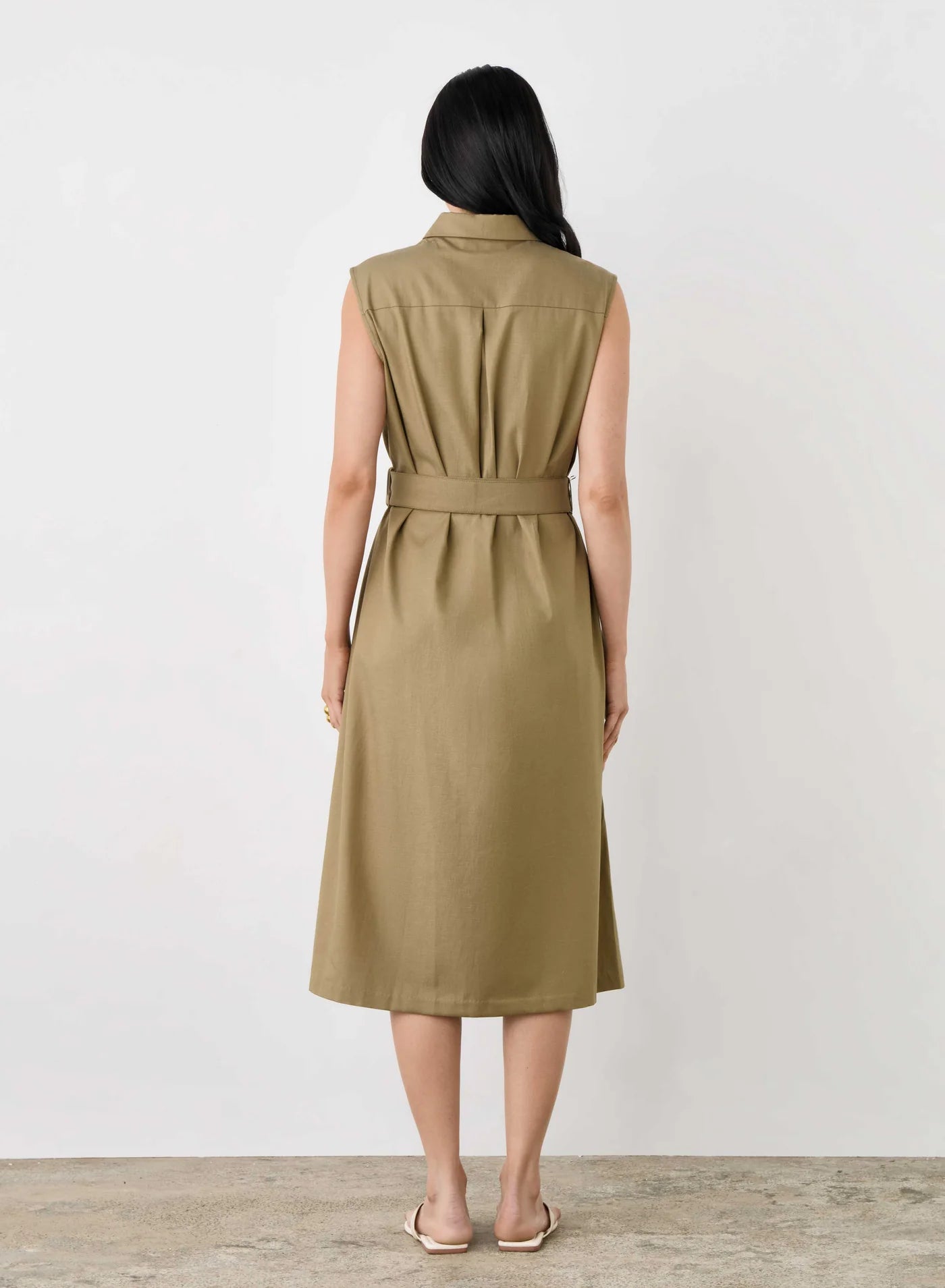 Elevate your wardrobe with the Esmaee Sidewalk Dress in Khaki. Crafted from a soft Lyocell blend, this dress features a classic collared neck and functional button opening, making it versatile for year-round wear. Pair it effortlessly with boots for a chic fall look, flats for a casual spring day, or kitten heels for a polished evening ensemble. Its fully lined design and removable belt ensure a flattering fit. With practical front flap pockets and mindfully created fabrication, this dress combines style with sustainability. Embrace effortless elegance every season!