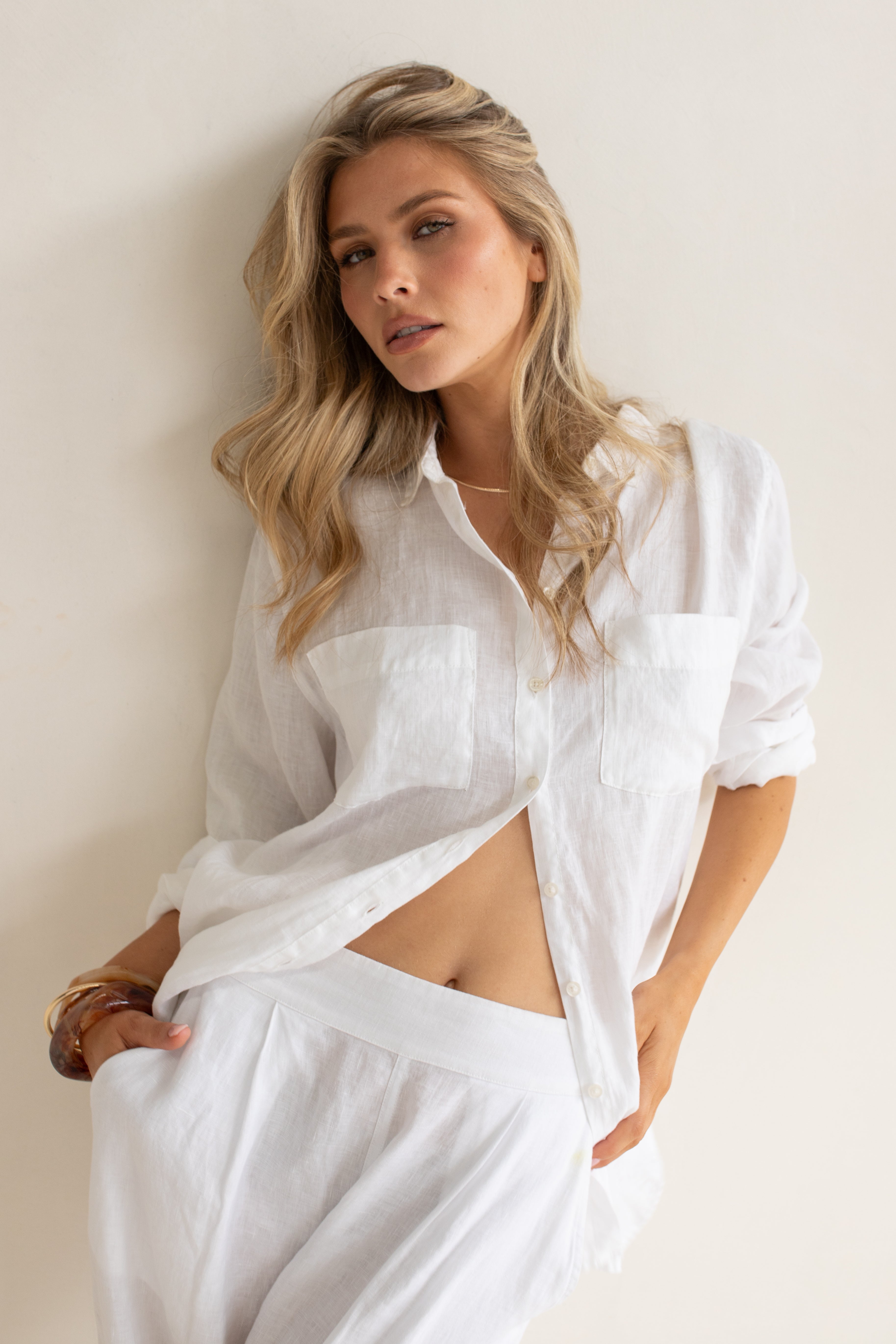 Fresh Crisp White Linen is as Classic as they come! Featuring two chest pockets.
