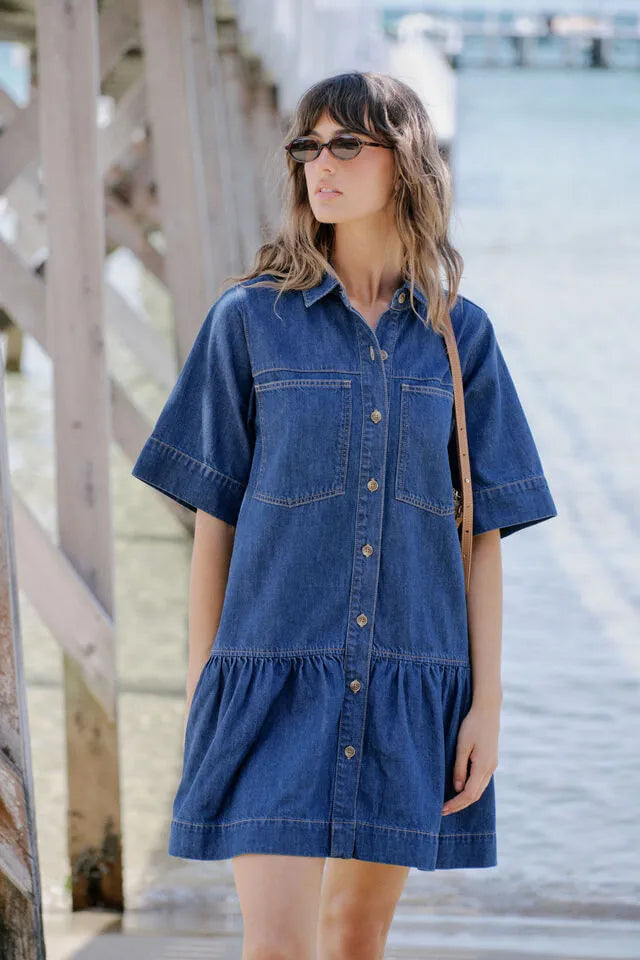 The Short Sleeve Tiered Pocket Shirt Dress is all about effortless charm. Crafted from lightweight denim with a soft hand feel, this dress is made using 100% organic cotton. This mini-length dress features a functional button placket, a relaxed boxy fit, and a flattering gathered tier. Perfect for those days when you want to look cute with minimal effort!