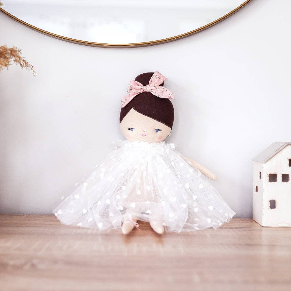 The Alimrose Mia Doll in White Flocked Heart Tulle is a graceful, heirloom-quality cloth doll made to inspire gentle play and endless imagination. At 44cm tall (approx. 17.3 inches), she’s wonderfully soft, beautifully detailed, and perfectly sized for cuddles and pretend play.