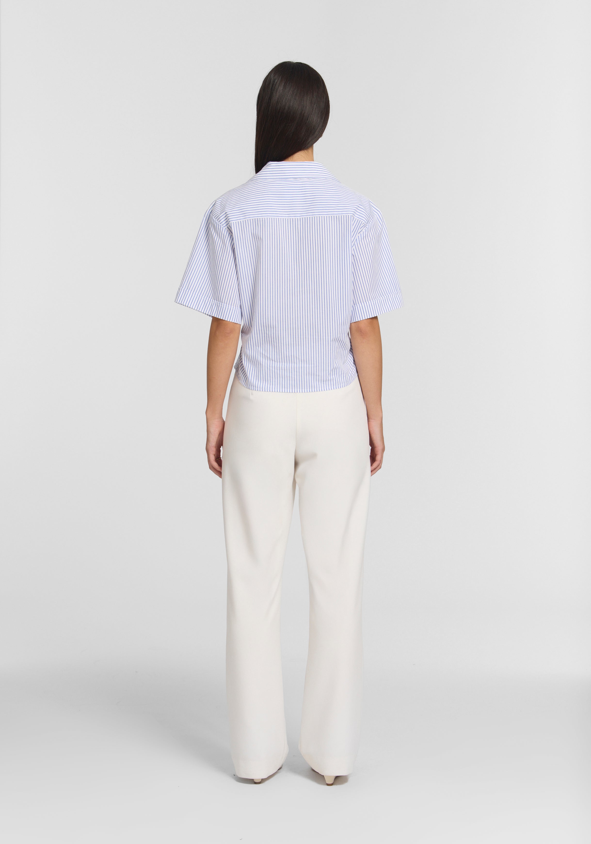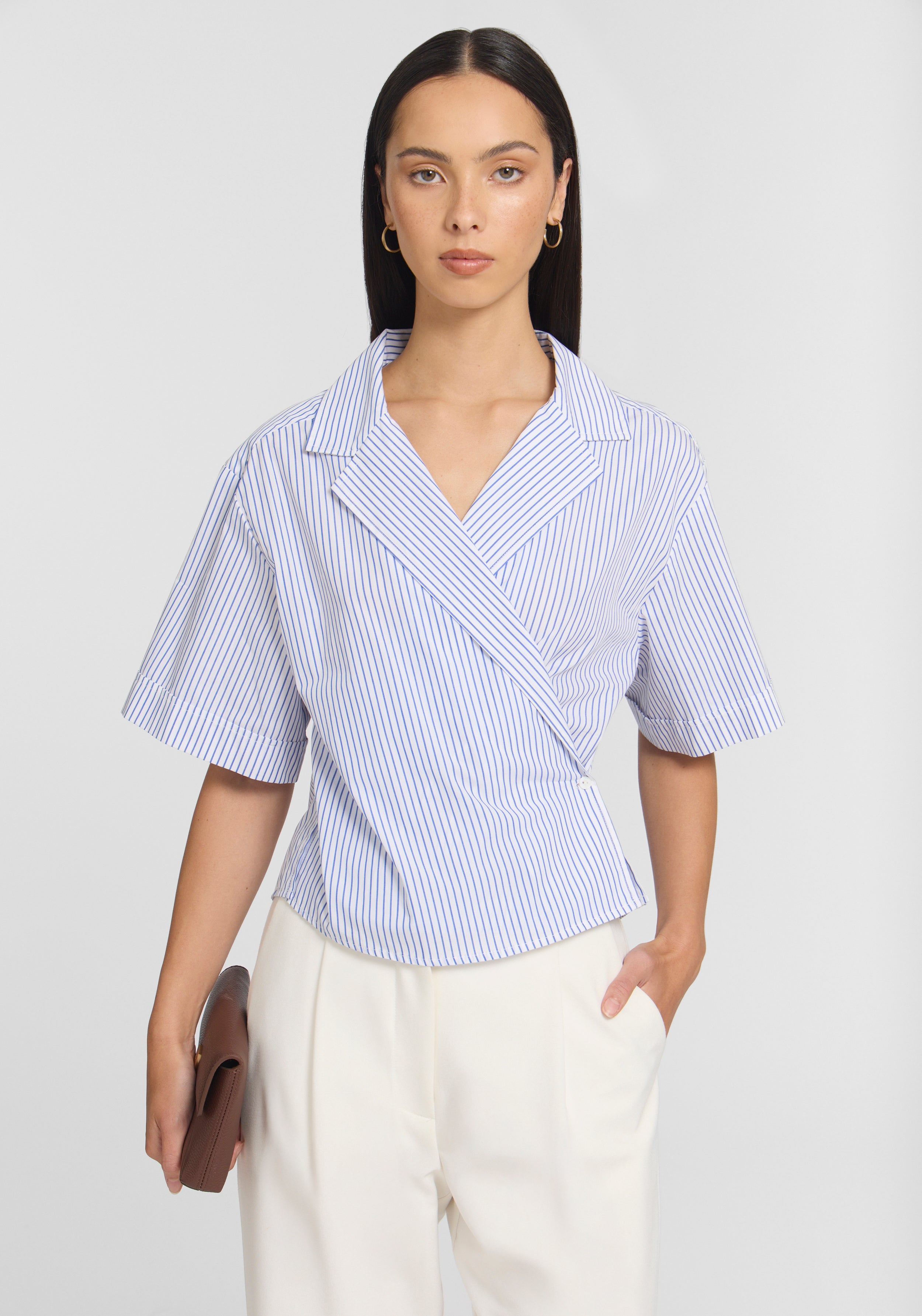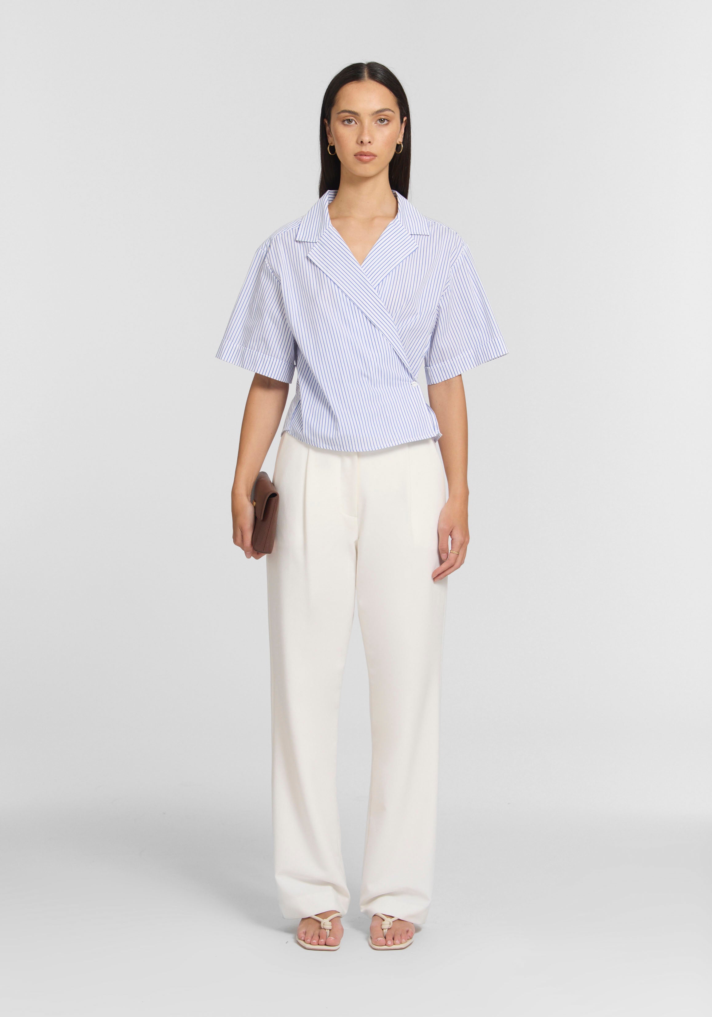 Evoking pure summer ease, the Zion Shirt is realised in a timeless light blue and white cotton stripe. Designed to take you through the summer events, the workday and in-between with it's unique wrap detail, refined collar, lapel, and, finished with wide sleeve hems, and side seam splits. Pair with the Ezra Skirt for an effortless high-summer uniform that channels the essence of retreat this season.