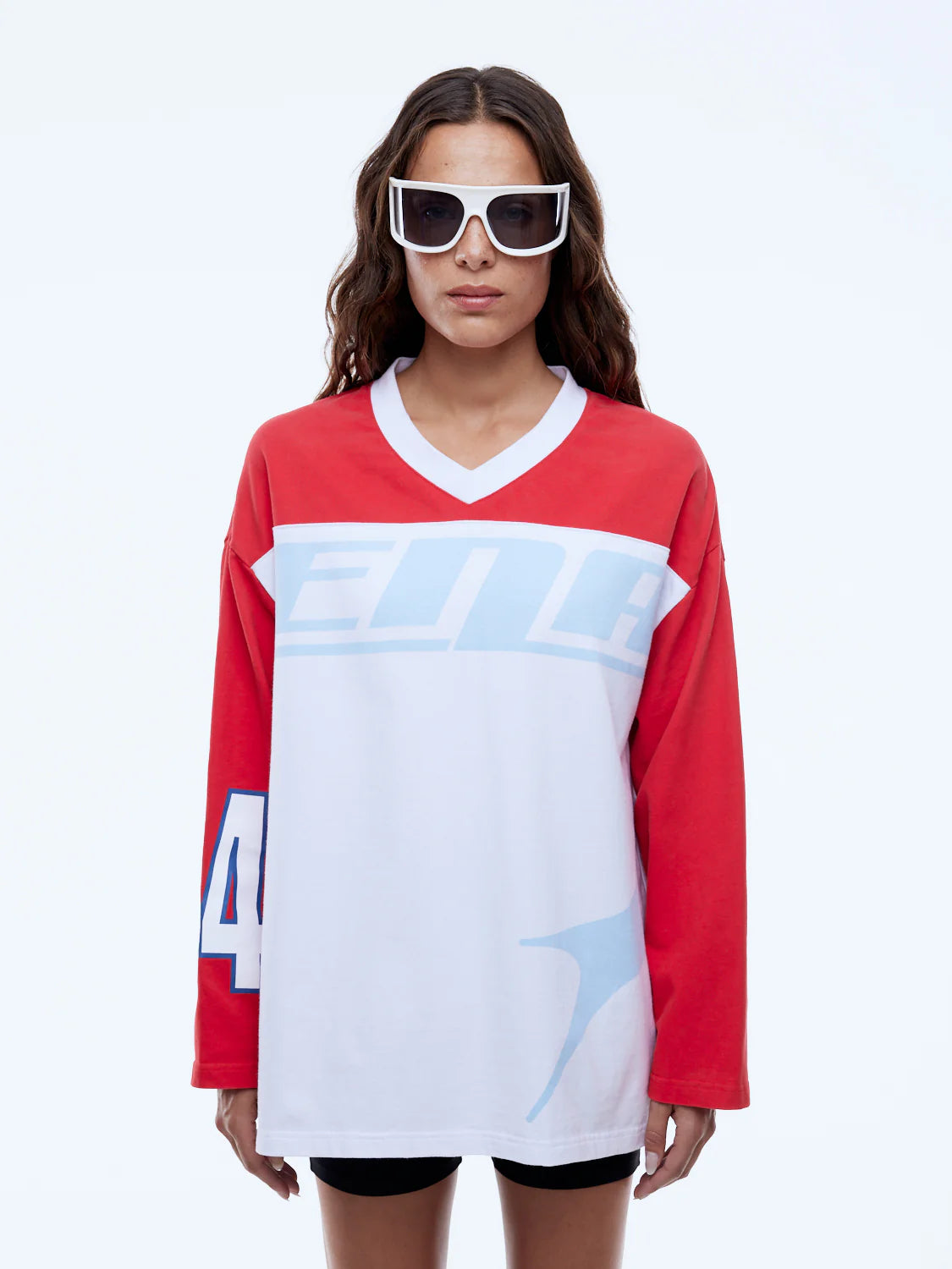 The Pelly League Long Sleeve Tee is made from breathable cotton with an oversized silhouette that feels relaxed yet considered. Designed with a v-neck and contrast neck band, it features contrasting yoke and sleeve panels, a vintage ombre wash and exclusive in-house graphics, finished with waterbased prints inspired by retro sports aesthetics.