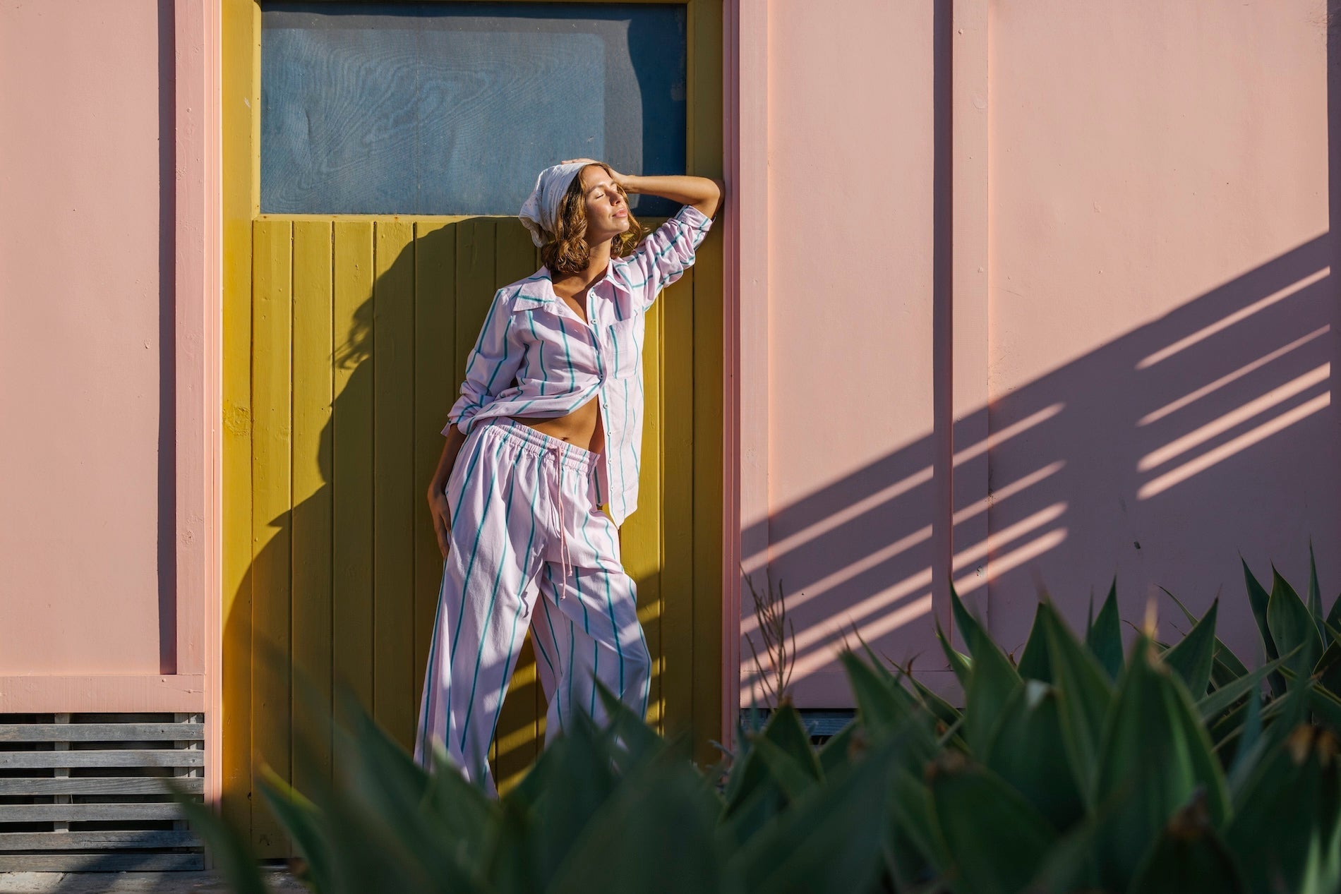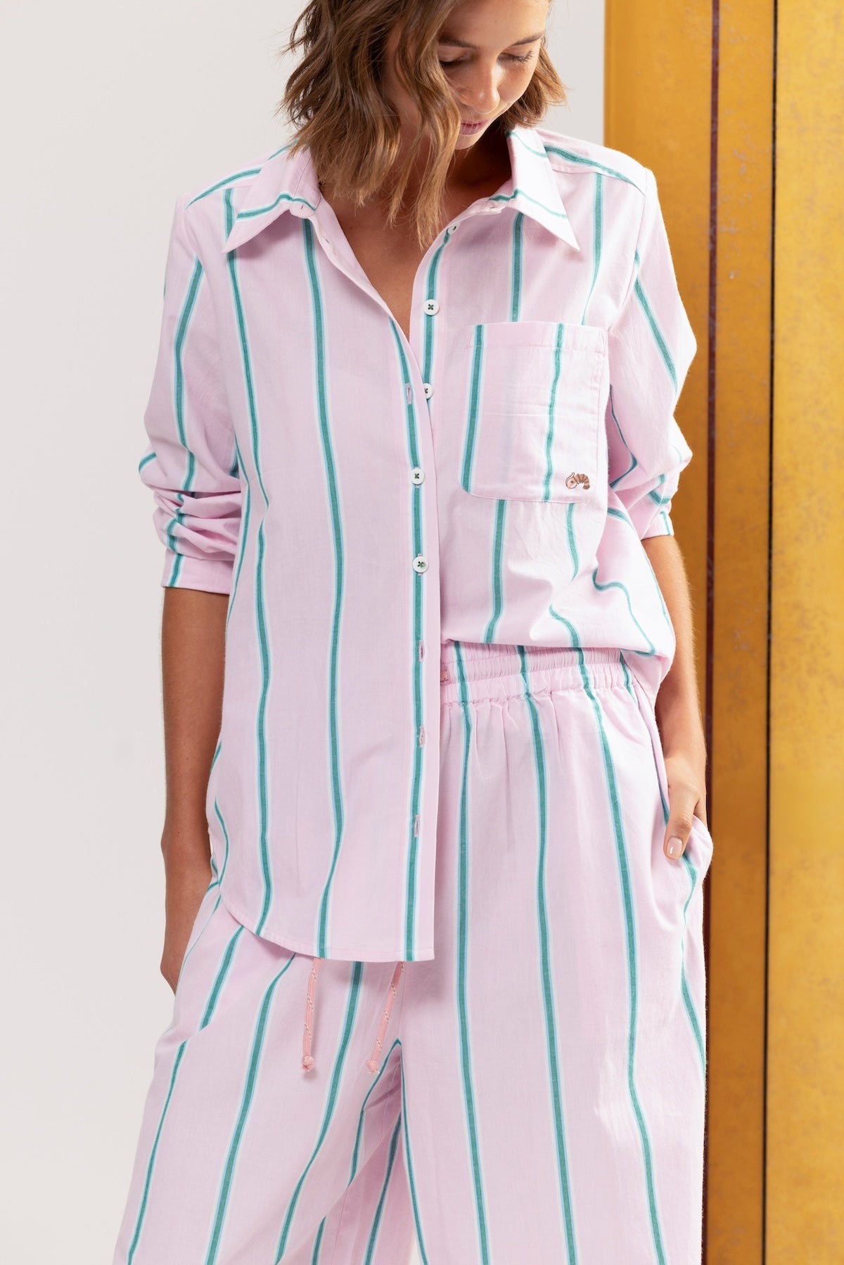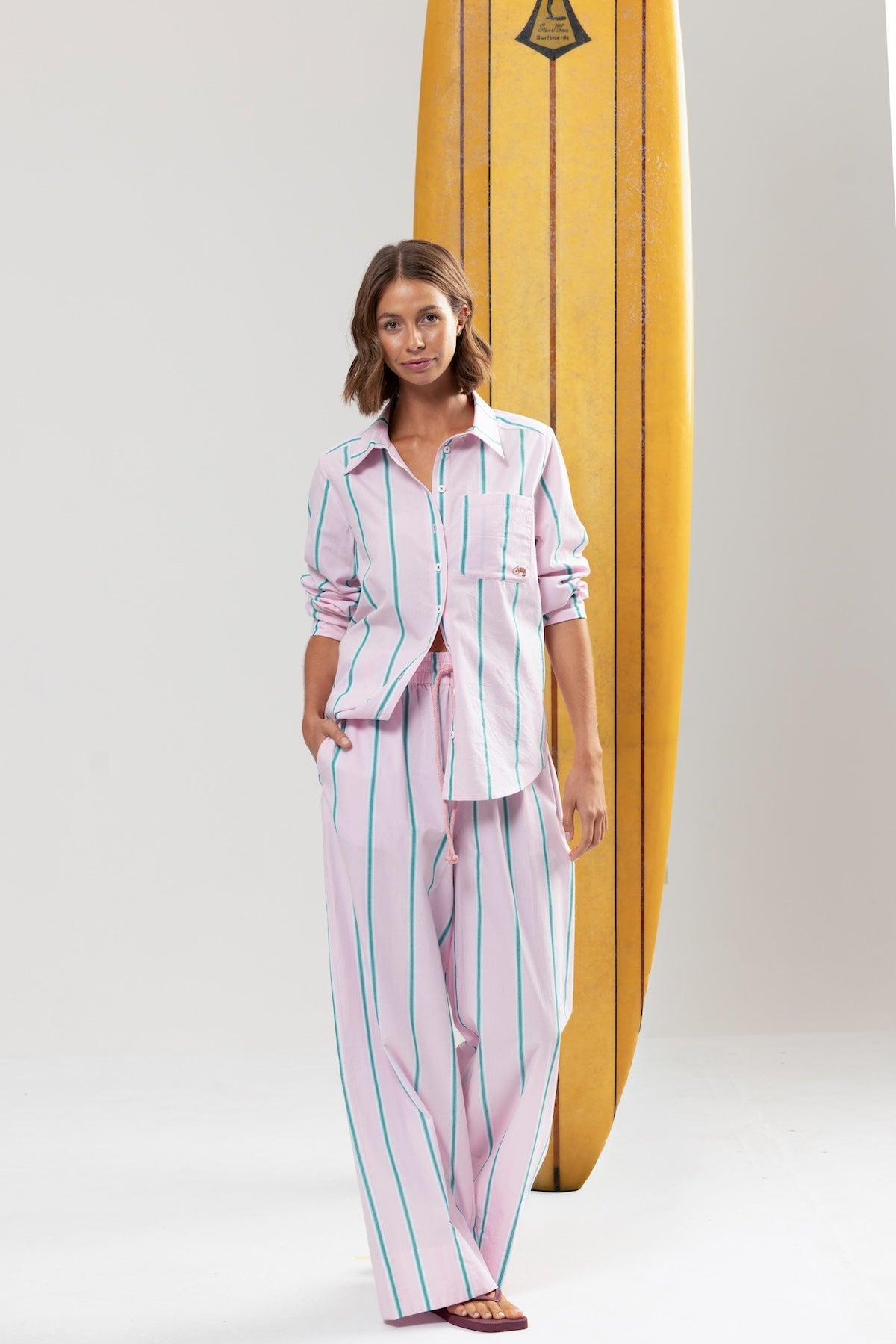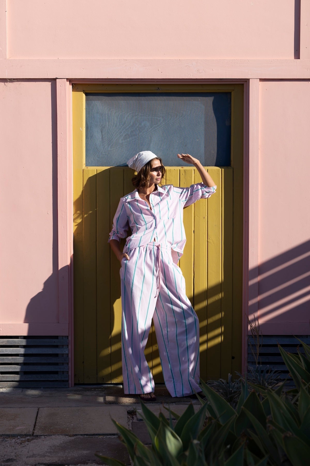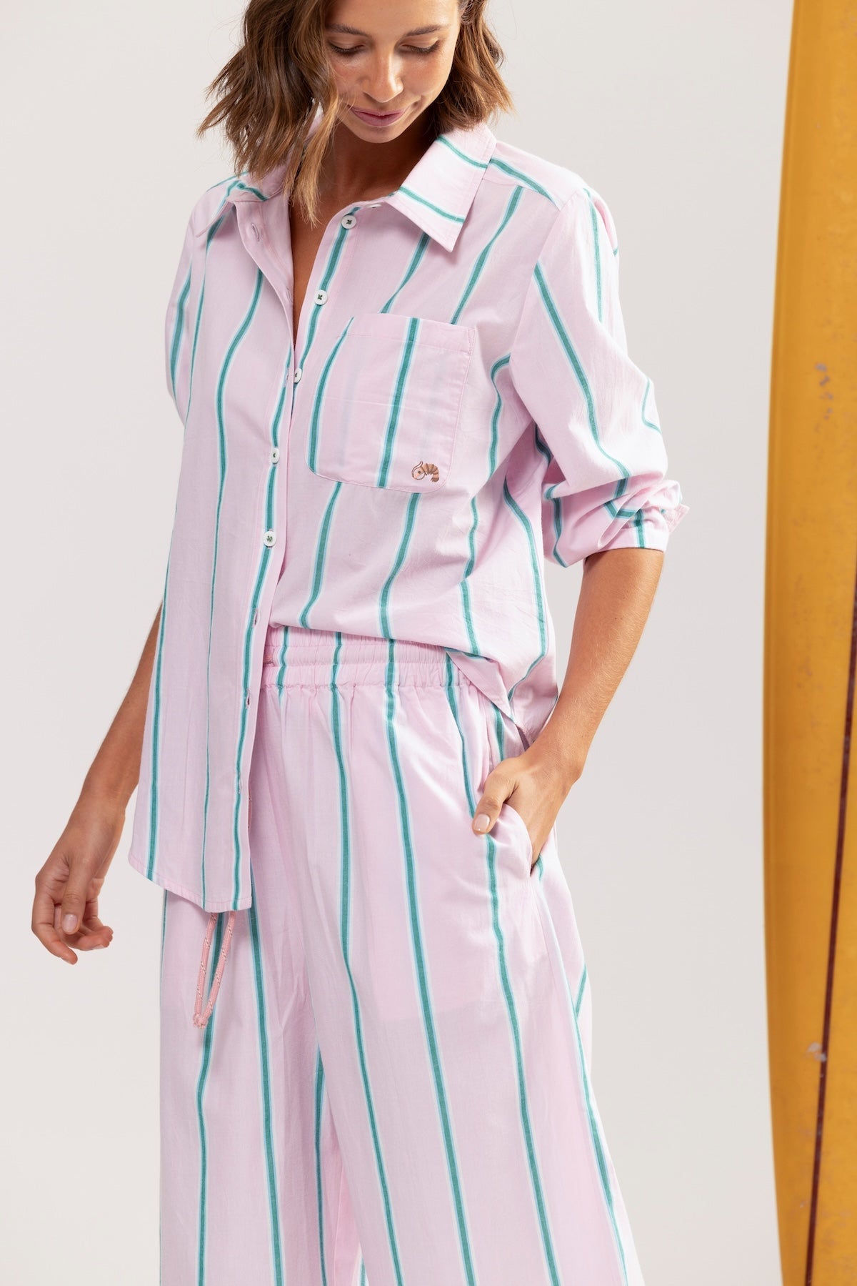 Yarndye cotton stripe in baby pink, white & green with a embroidered baby prawn friend on the pocket. It’s your not-so-basic button-up. Set & Forget how cool you look in our OFFSHORE matching pant.