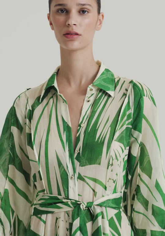 Cut from midweight cotton featuring an exclusive Morrison print, the Sorrento Shirt Dress pairs a traditional collar and button placket with 3/4 sleeves and pintuck detailing. The flared midi skirt and waist tie add movement and shape, while a separate slip ensures ease and comfort.