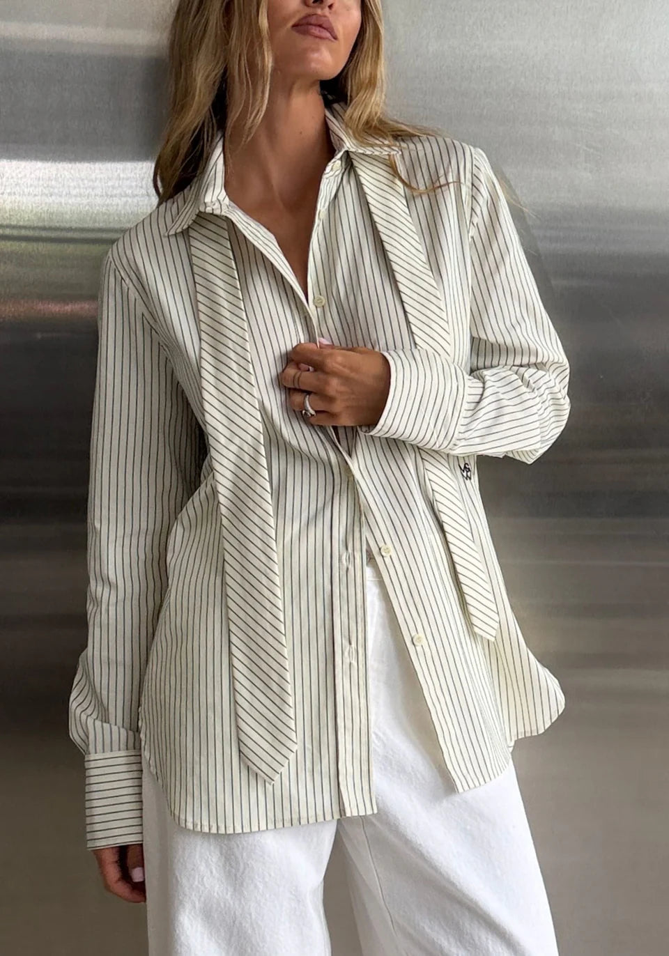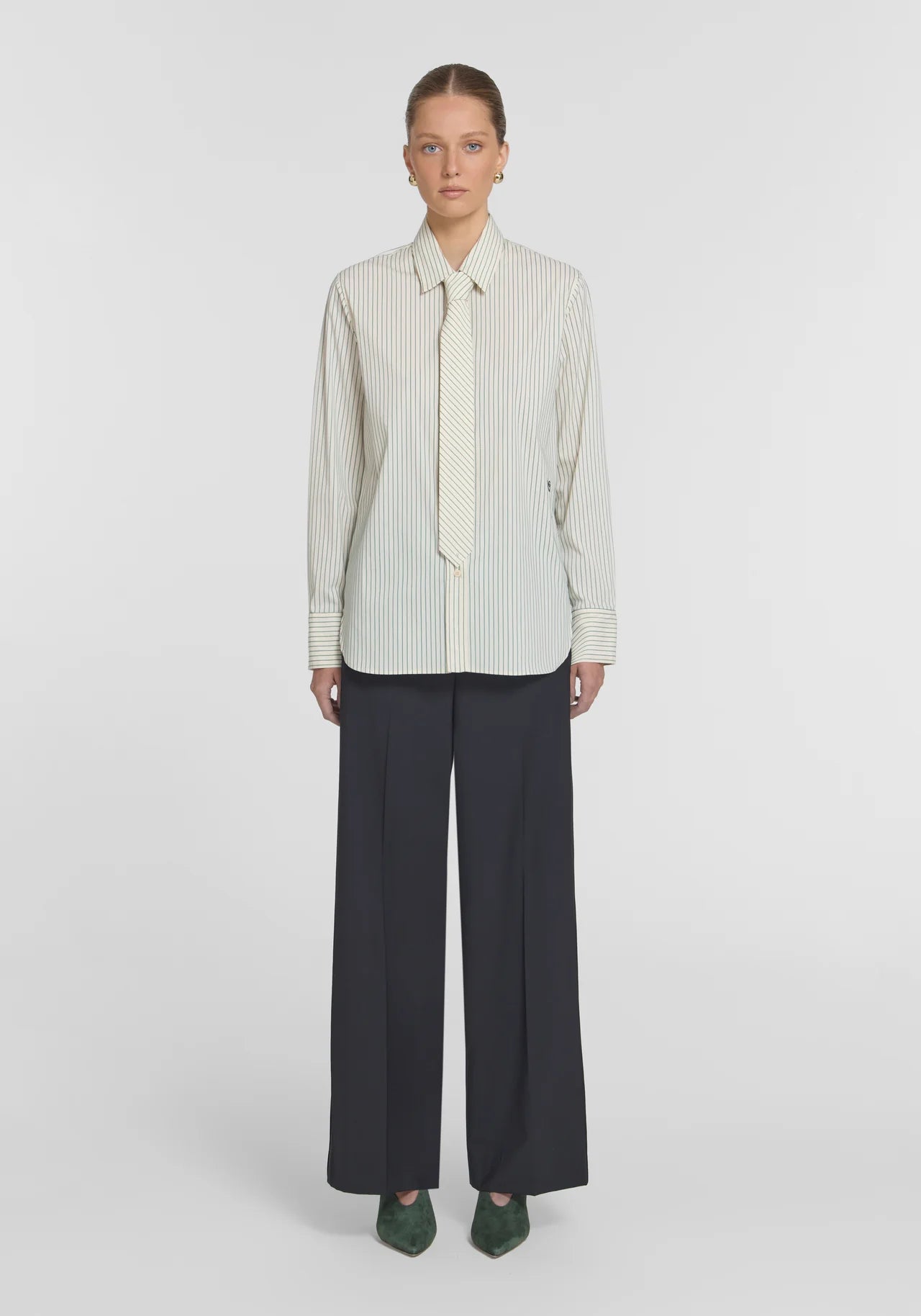 Representing the intersection of utility and authority, the Commandment Shirt is crafted from a cotton blend in a versatile green stripe, offering a comfortable stretch and polished finish. Designed with a traditional collar and placket, relaxed fit, and signature details including V&W buttons and embroidery. Wear with the V&W Tie to bridge corporate and creative, delivering a uniform of effortless professionalism.